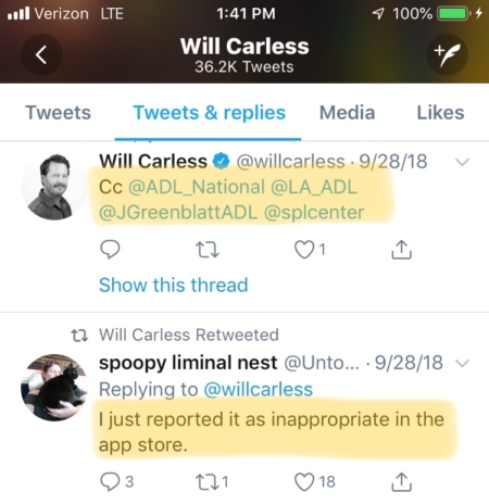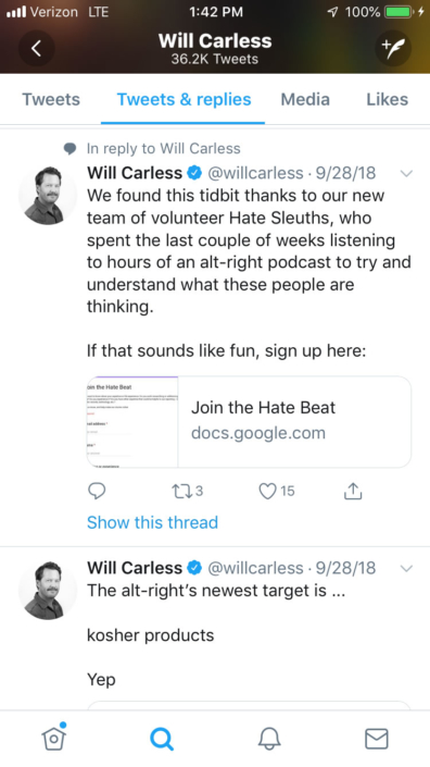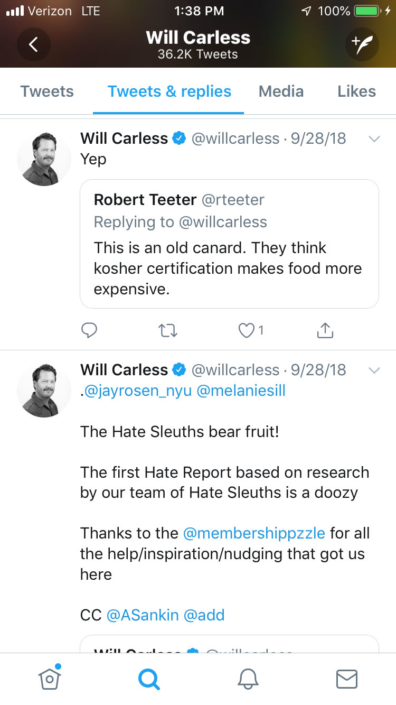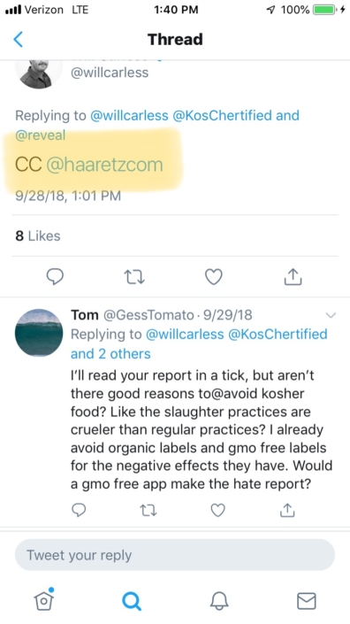 2 When RevealNews.org’s journalist Will Carless tweeted to his superiors about his new Hate Report victim, the KosChertified? app, he made sure to cc three separate recipients at the Anti-Defamation League (ADL) in addition to the Southern Poverty Law Center (SPLC) and an Israeli newspaper.